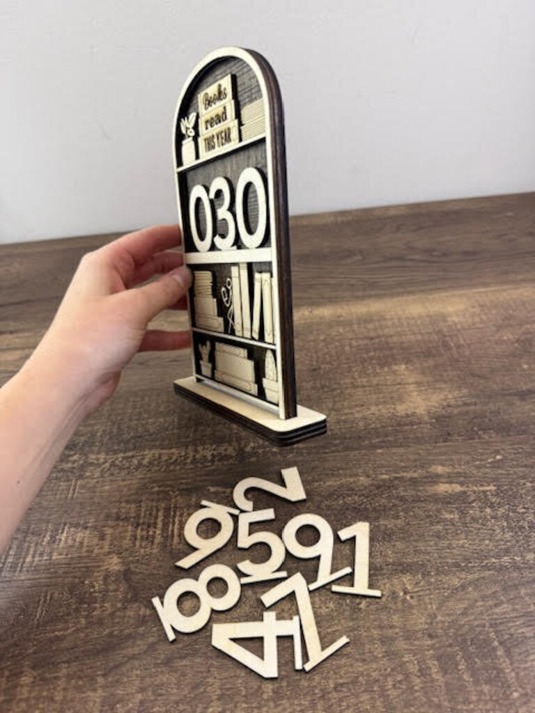 This Books Read This Year wooden reading tracker is designed to look like a cozy bookshelf, making it easy—and fun—to track how many books you’ve read throughout the year using removable wooden numbers.