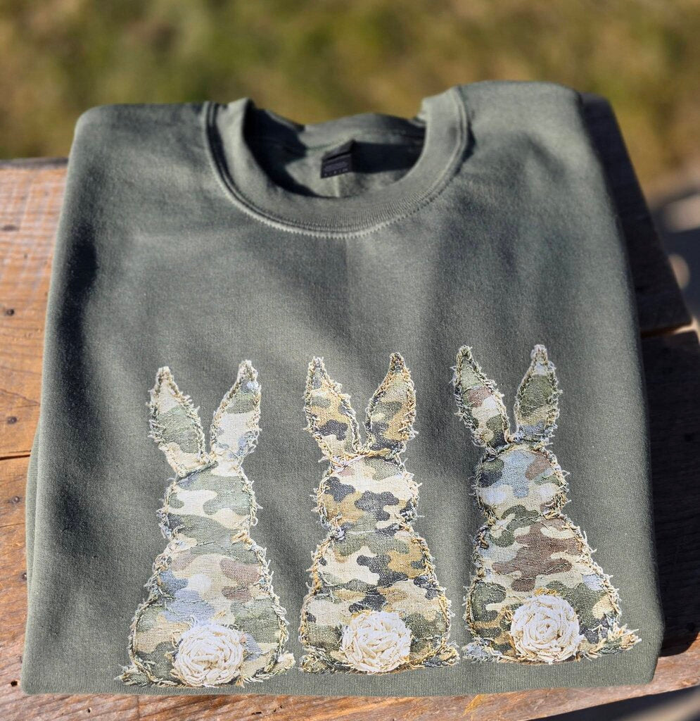 Add a fun rustic touch to your Easter style with this custom camo bunny crewneck. Featuring three adorable camo-pattern bunnies with sweet floral tails, this design blends a little farmhouse charm with an outdoorsy vibe.