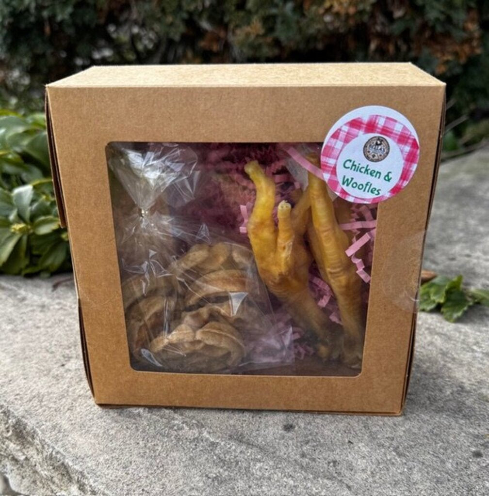 Our Chicken & Woofles treat box pairs crunchy, protein-packed dehydrated chicken feet with naturally sweet apple woofles for a fun and nutritious snack. Itโs the perfect mix of savory and sweet for your furry friend.