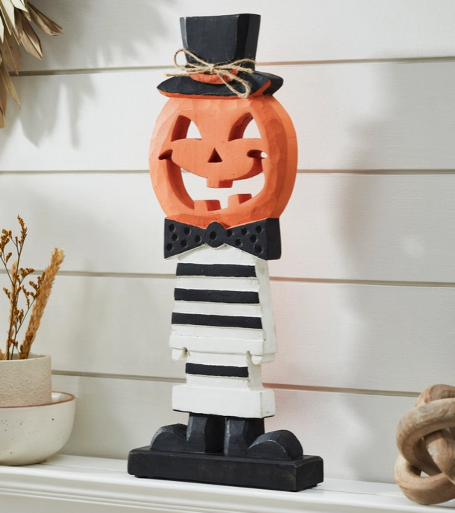 Measuring 7.5x17.5 inches, this whimsical figurine features a grinning Jack-O-Lantern dressed in a fun, prison-striped outfit complete with a black top hat, bow tie, and black boots. The bright pumpkin orange color, contrasted with deep black and bright white accents, creates a striking and humorous focal point for your fall and Halloween displays. Crafted from durable tropical wood, this Jack-O-Lantern is painted with vibrant, bold colors and designed to stand out in any room. The unique design, with its playful nod to an escaped character, adds a lighthearted touch to your seasonal decor.