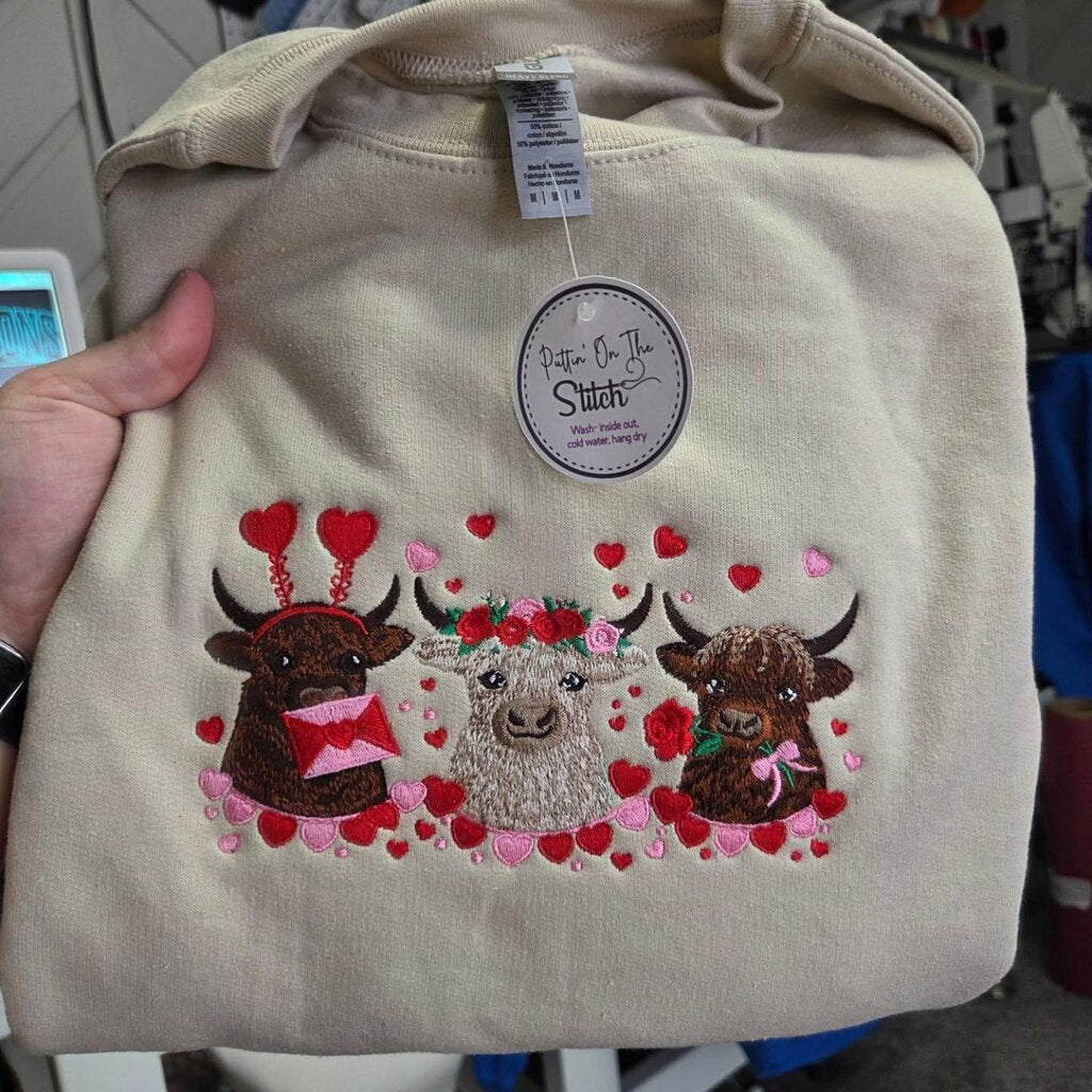 Featuring three charming Highland cows surrounded by hearts, florals, and Valentine flair, this cozy crewneck is a true statement piece.