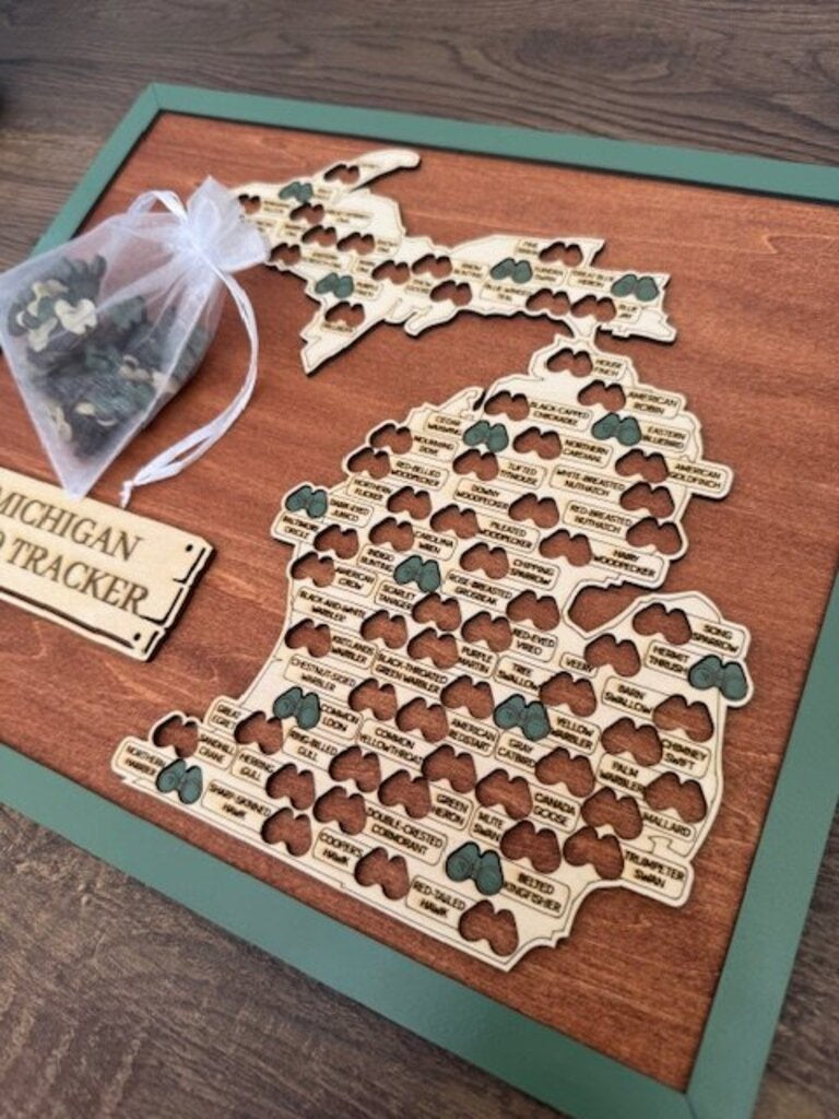 As you spot each bird, mark it off and watch your journey across Michigan’s forests, wetlands, lakes, and backyards come to life. More than décor, this piece becomes a growing keepsake of your birding memories across the Great Lakes State.