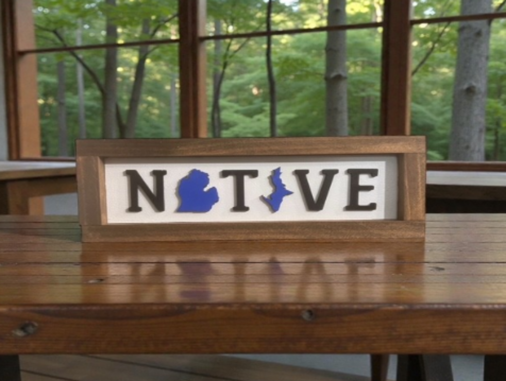 Show off your Michigan pride with this MI Native shelf sitter! Featuring a classic wood frame stained in a rich dark walnut, this sign adds the perfect touch of rustic charm to shelves, desks, mantels, or tiered trays. A simple yet bold statement piece for any Michigan lover.