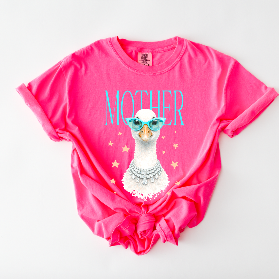 This fun and sassy graphic tee features a stylish goose with sunglasses and the word “Mother.” Bright, bold, and perfect for moms with personality!