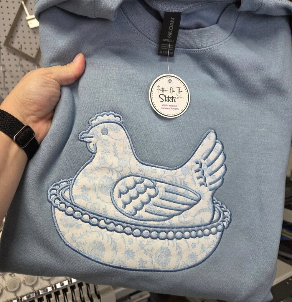 Cozy, artisanal crewneck with nesting hen appliqué. Available in Stone Blue (Gildan Soft style crewneck)- Unisex sizing.