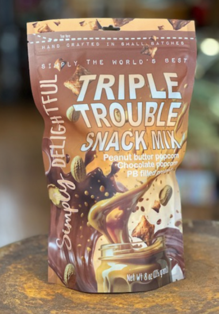 - Triple Trouble Snack Mix: Chocolate popcorn combined with our peanut butter popcorn (yes, we use real JIF peanut butter) and peanut butter filled pretzel nuggets.
