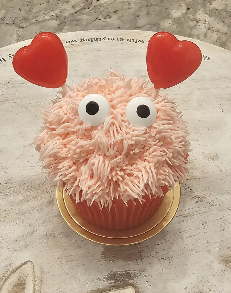 - "Love Bug" - Jumbo cupcake decorated with buttercream frosting and topped with 2 heart lollipops and candy eyes