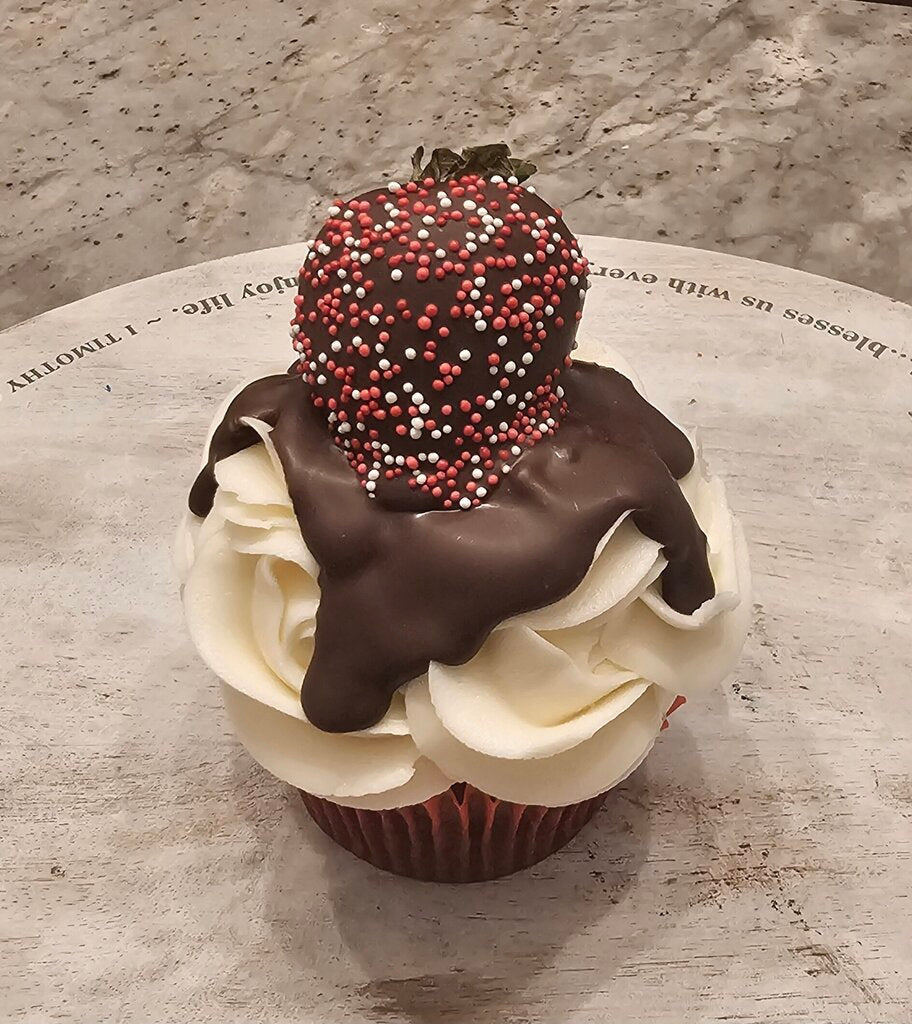 - Chocolate Covered Strawberry - Jumbo cupcake decorated with buttercream frosting and topped with chocolate drizzle and a chocolate covered strawberry