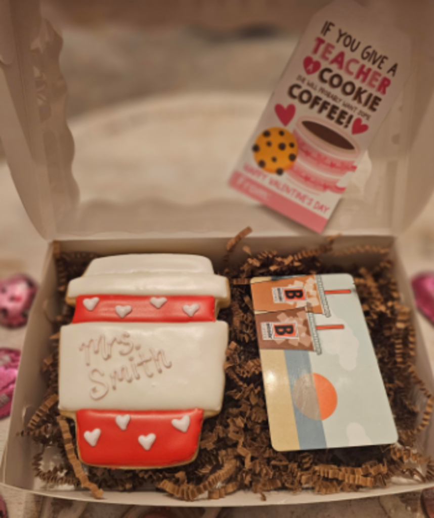 - Sugar cookie sleeve filled with 5 mini heart cookies, tied with a ribbon.