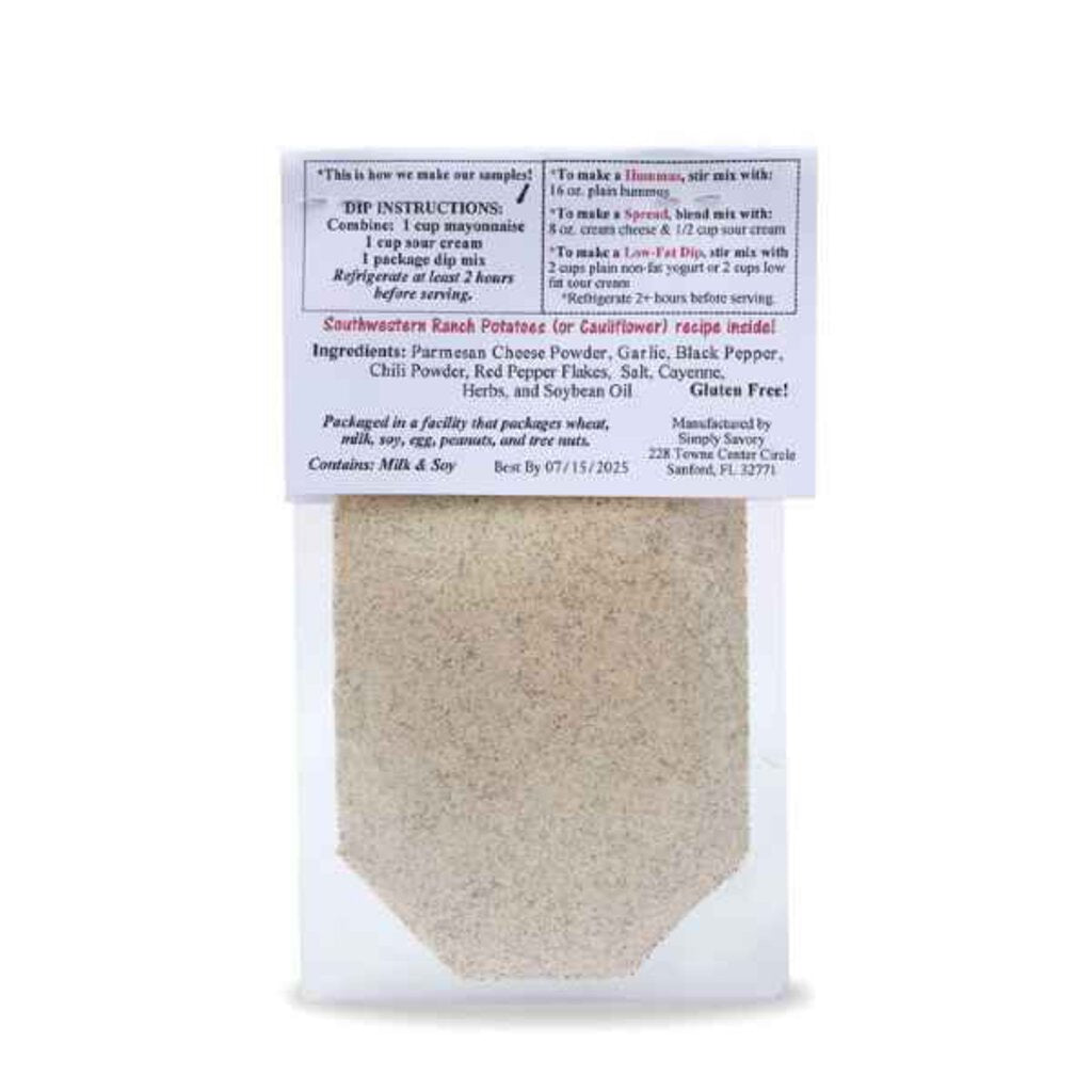 Kick it up a notch with a little southwestern spice in your favorite ranch flavored dip. Southwestern Ranch is great with chicken fingers, fries, pretzels, veggies and just about anything else you usually enjoy ranch with. Try our recipe for Southwestern Ranch Potatoes (or cauliflower!) on the inside of the label.
