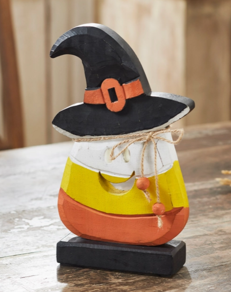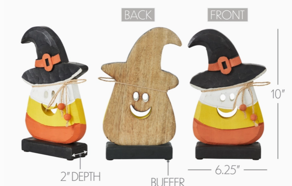 Measuring 6.25x10 inches, this charming figurine features a classic candy corn design with vibrant orange, sunshine yellow, and white stripes. The candy corn body is topped with a black witches hat adorned with a twine bow and orange beads, giving it a whimsical and fun Halloween vibe. Crafted from durable tropical wood, this painted figurine is perfect for adding a pop of color and festive spirit to your fall decorations. The smiling face carved into the candy corn adds a lighthearted touch, while the distressed finish enhances its rustic, primitive charm.